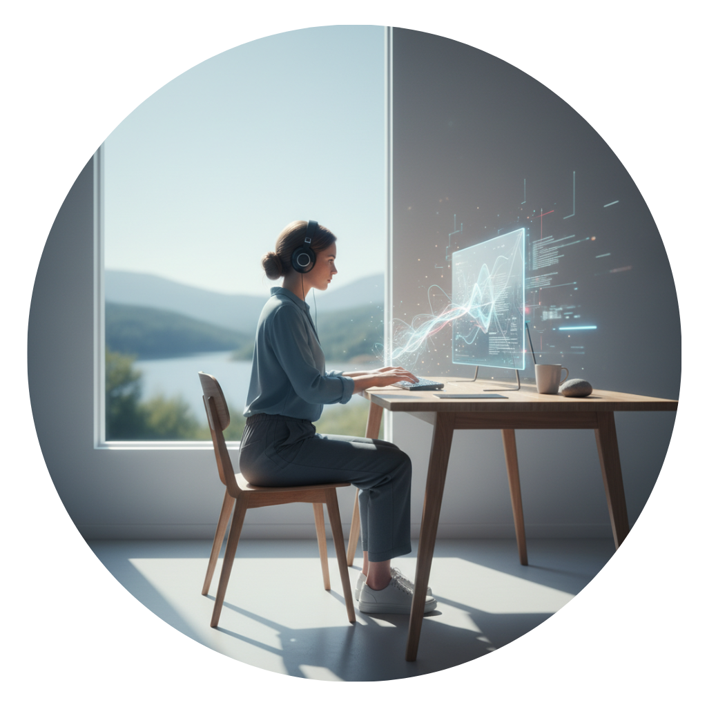 Minimalist music and natural soundscapes designed for thought observation. A low-impact tool for conscious breathing and micro-breaks in your workday, bringing mindfulness to work and eating.