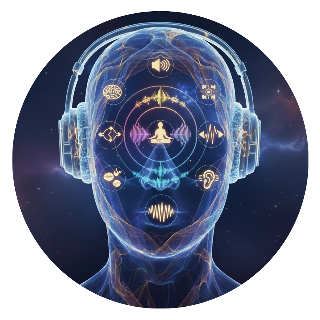 The Binaural Beats technology employs a precise acoustic methodology. By presenting two slightly different tones to each ear, a third frequency is induced, which generates brainwave modulation. This process intentionally guides neural activity toward the desired state of consciousness: from Delta rest to Gamma lucidity.